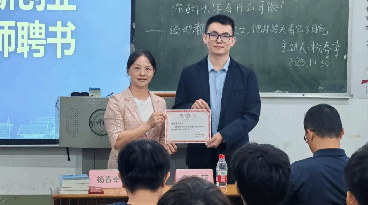 讲座中,余倩花为杨春幸颁发“创新创业指导老师聘书”,感谢他为学院双创工作给予的大力支持。她高度肯定本次讲座以“同行者叙事”的创新形式打破传统说教,以学长真实的职场和创新创造经验为学子们带来了有共鸣的朋辈赋能,鼓励大家以理想为帆,细化目标,久久为功,勇探创新创业之路。
