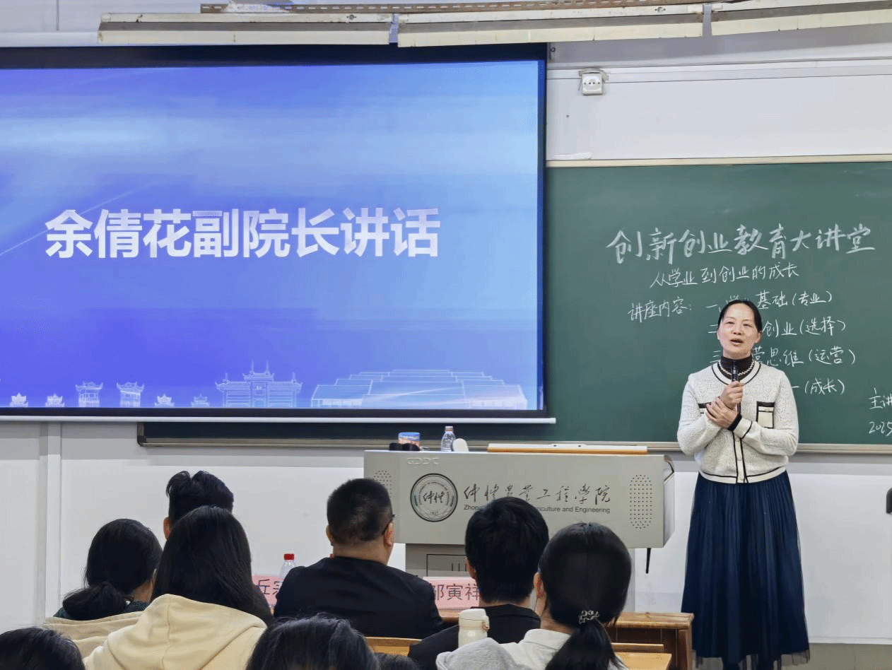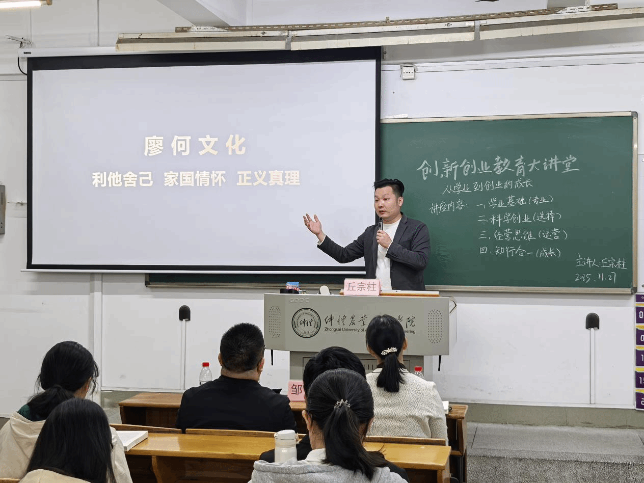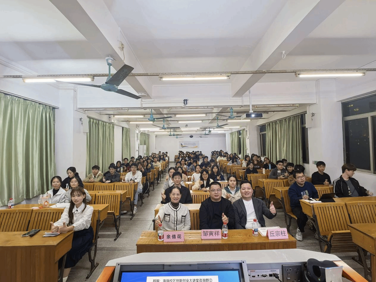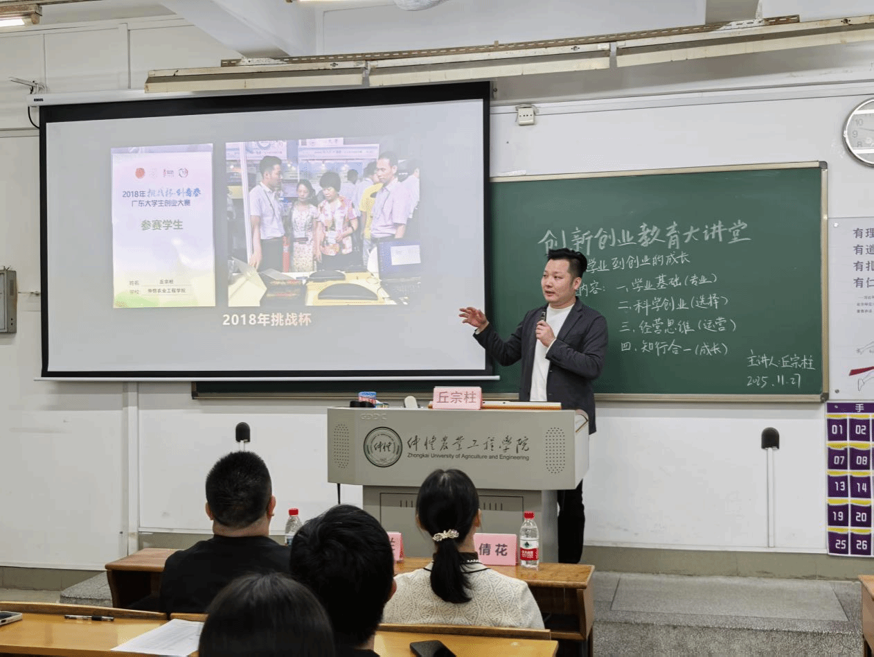 11月27日晚,创新创业教育大讲堂第十讲在海珠校区教学楼803室成功举办。本次讲座以“从学业到创业的成长”为主题,特邀仲恺农业工程学院2016届工业设计(产品设计造型)专业校友、佛山市壹思维教育咨询有限公司总经理丘宗柱主讲。维音乐器创始人兼十年外贸跨境创业者邹寅祥,创新创业教育学院副院长余倩花出席活动,来自人工智能学院、何香凝艺术与设计学院及人文与社会科学学院的110余名学生共同参与,现场氛围热烈。