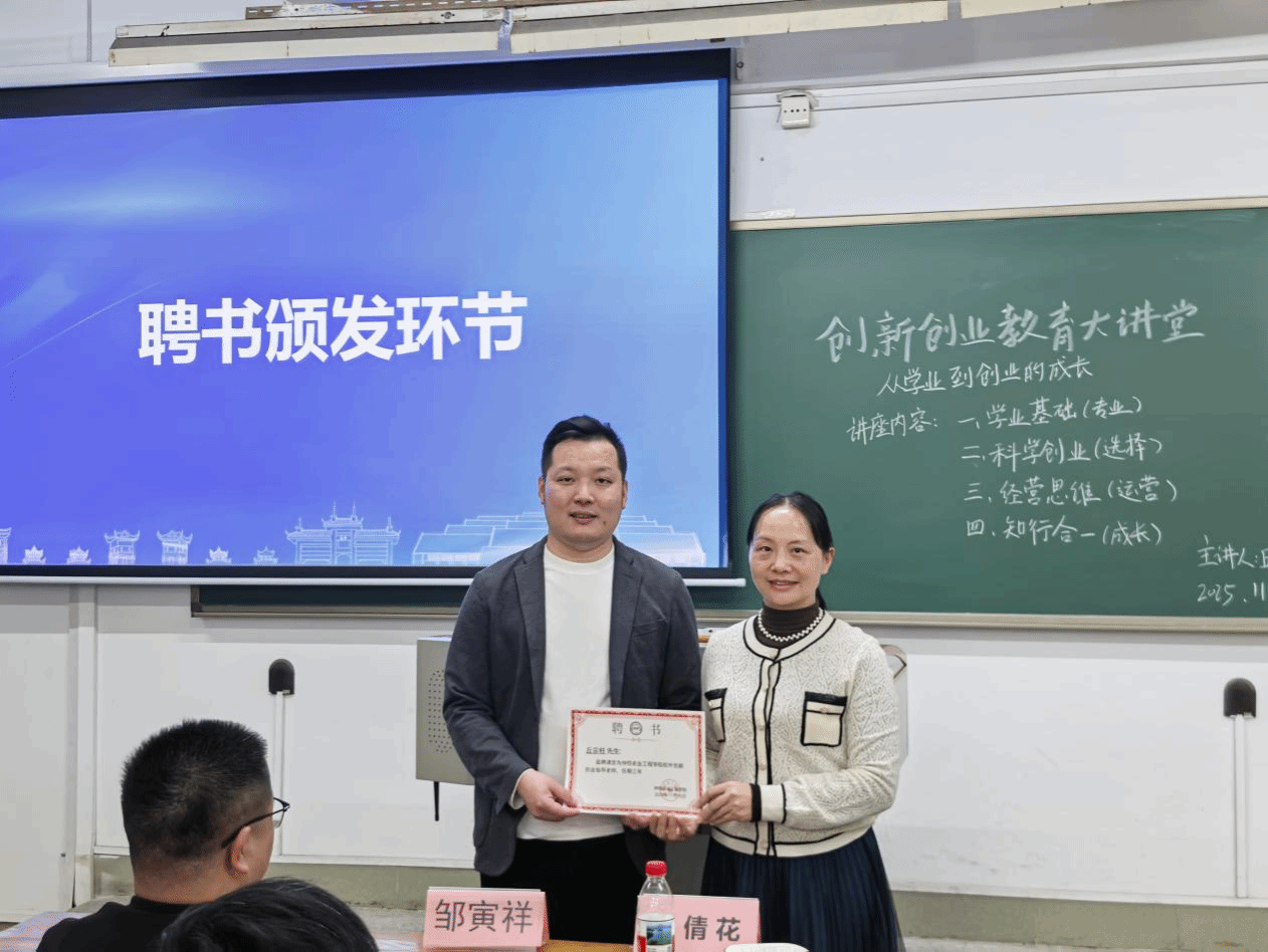 讲座后,余倩花为丘宗柱颁发“校外创新创业教育指导老师”聘书,正式邀请优秀校友助力学校创新创业教育高质量发展。在讲座的总结讲话中,余倩花感谢校友对学校创新创业教育工作的大力支持,鼓励同学们要着力培养自己的学习力、行动力,通过参与创新创业项目训练,踊跃参加中国国际大学生创新大赛、“挑战杯”系列竞赛等顶级双创赛事等,积极借助双创教育平台磨炼过硬本领、提升核心竞争力。